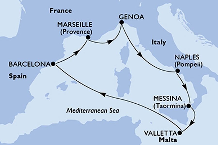 ITINERARIO: NAPOLI - MESSINA - LA VALLETTA - BARCELLONA - MARSIGLIA - GENOVA - NAPOLI